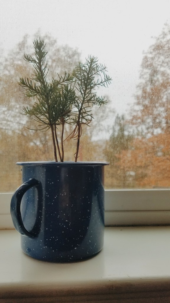 Today it was my baby trees I’m attempting to keep alive after saving them at work. Adeste Fideles played softly. (Yes, of course Christmas music already.) The trees outside stretched their autumn robes to the sprinkling rain, and it was just a moment. A moment to stop and breath and thank God for the beauty He gives me every day.